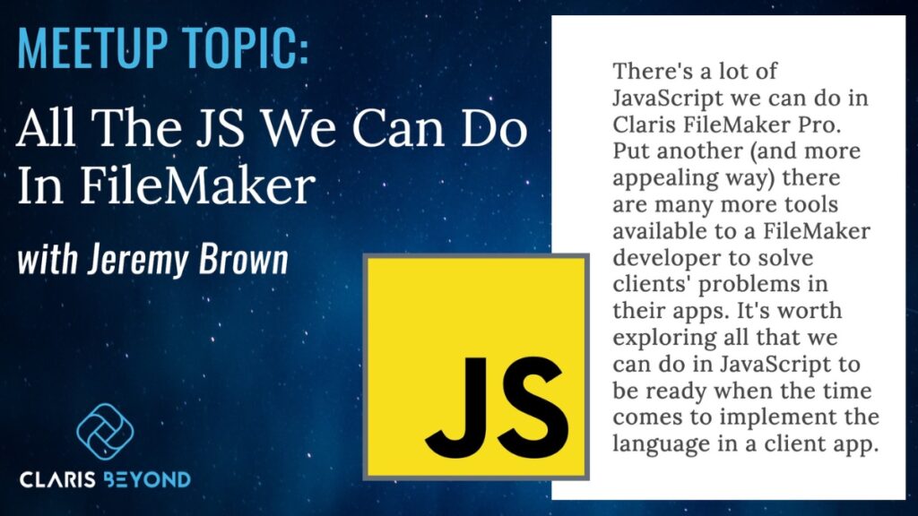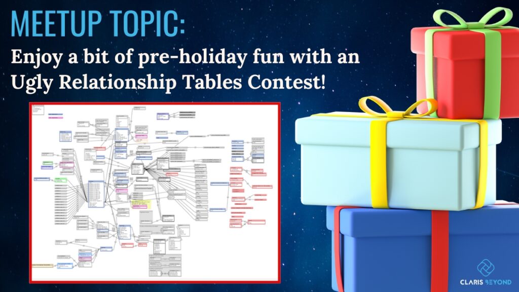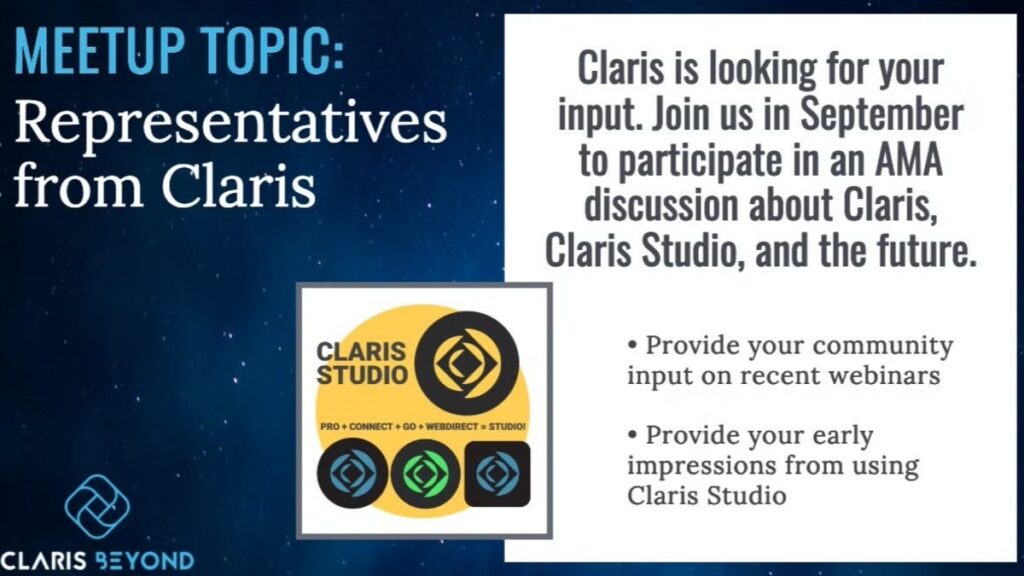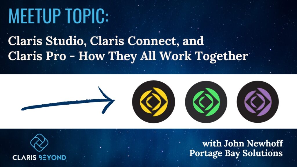 “Claris Beyond is a free user group sponsored by Portage Bay Solutions designed to expand your programming and development knowledge of Claris FileMaker, FileMaker integrations, Claris Connect, REST API, and other third-party FileMaker tools. The group is open to everyone and provides a space for users of all levels of experience.”
