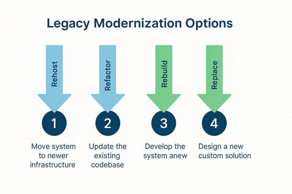 Legacy modernization doesn’t always mean a complete rebuild. Depending on the system’s age, architecture, and role within your organization, there are several viable paths forward. Most organizations choose one of the following: